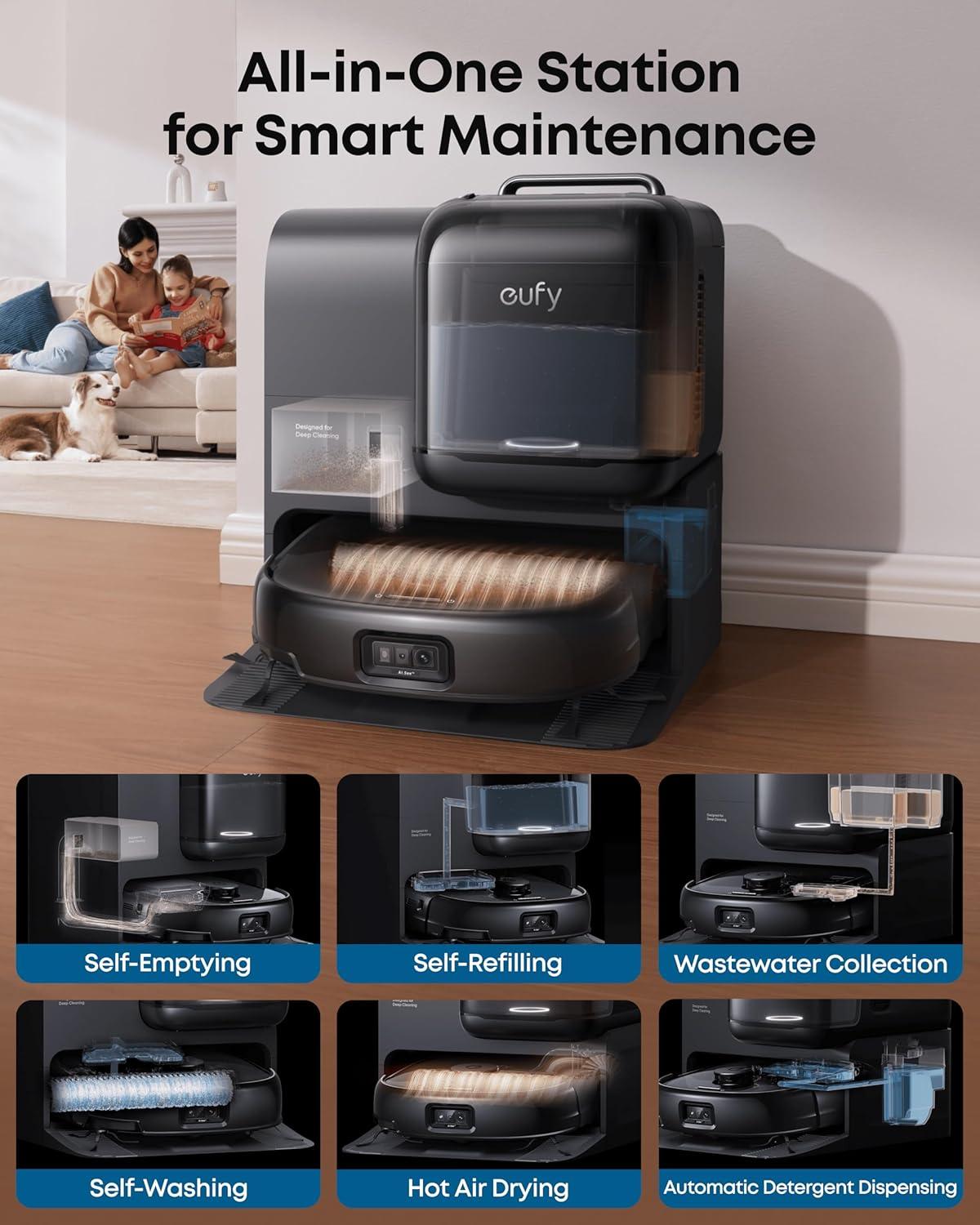 All-in-One Station: Streamlines daily cleaning with self-emptying, self-washing, self-refilling, hot air drying, automatic detergent dispensing, and wastewater storage.